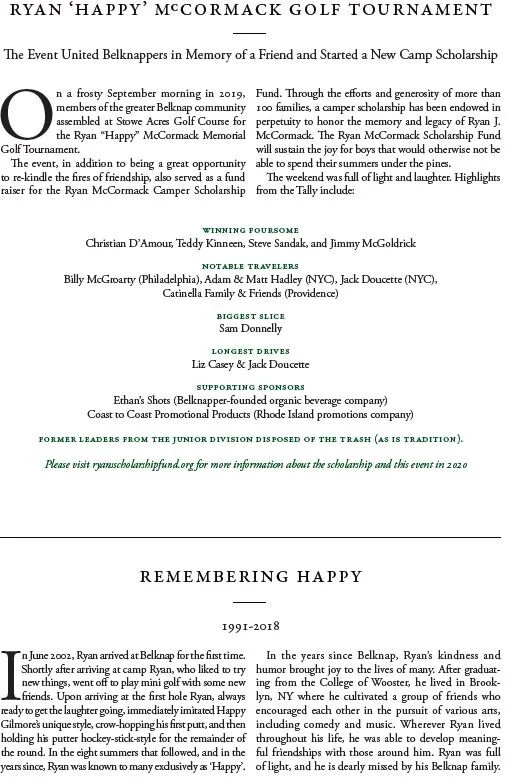 Ryan at Belknap: Ryan was a camper at Belknap from 2002-07, a member of the Leader Corps in 2008 and a Leader in Training in 2009. During his eight years at Belknap, he made countless impacts on those he met through the kindness, compassion, and empathy he consistently demonstrated towards others. Ryan embodied the Belknap Spirit, and it is in his memory that boys in the future will have the opportunity to experience that same spirit.